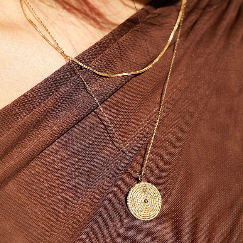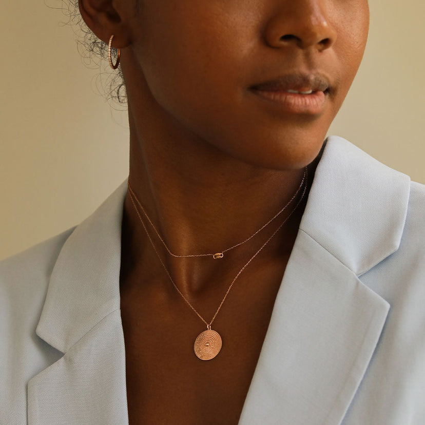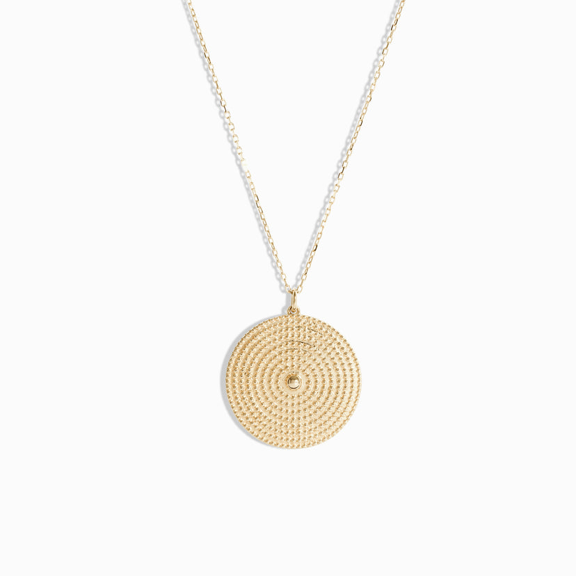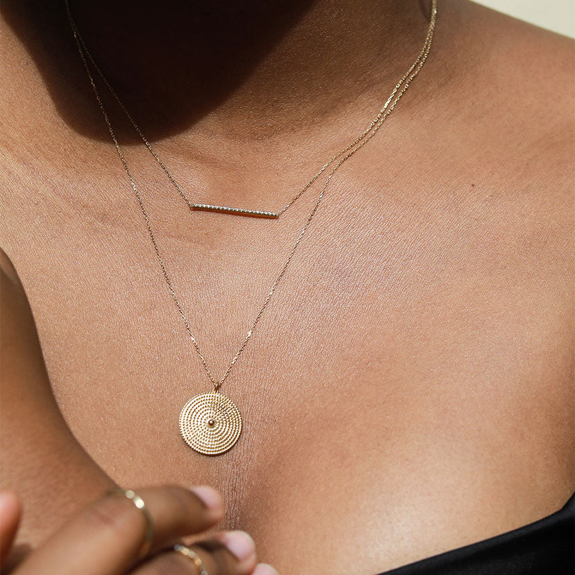 Rows and rows of polished beads lined up in perfect symmetry make this solid gold necklace a feast for the eyes. Handcrafted in solid gold, the Beaded Circle Necklace has a luxurious weight to it that feels great on your skin. Take your outfits up a notch by wearing it on your backside with a deep-cut top.