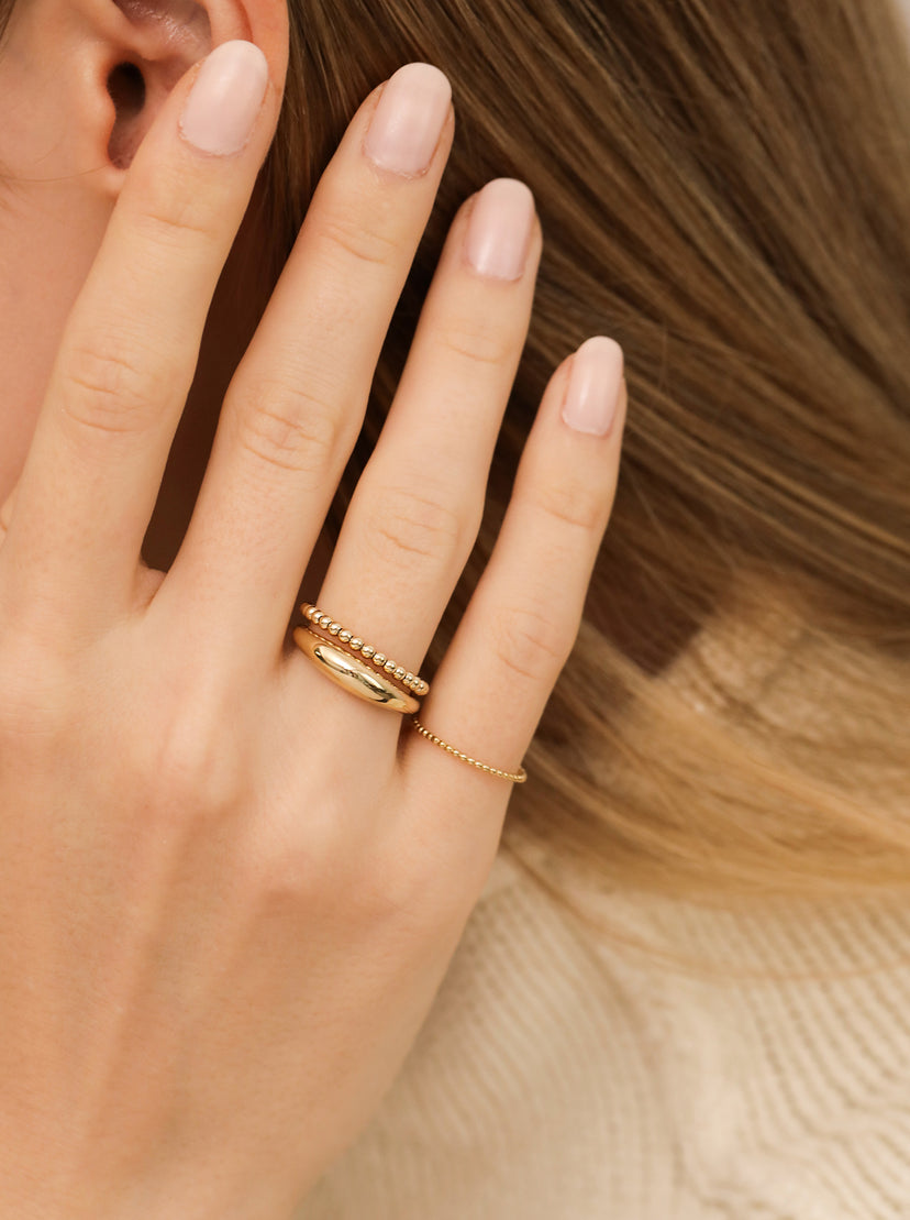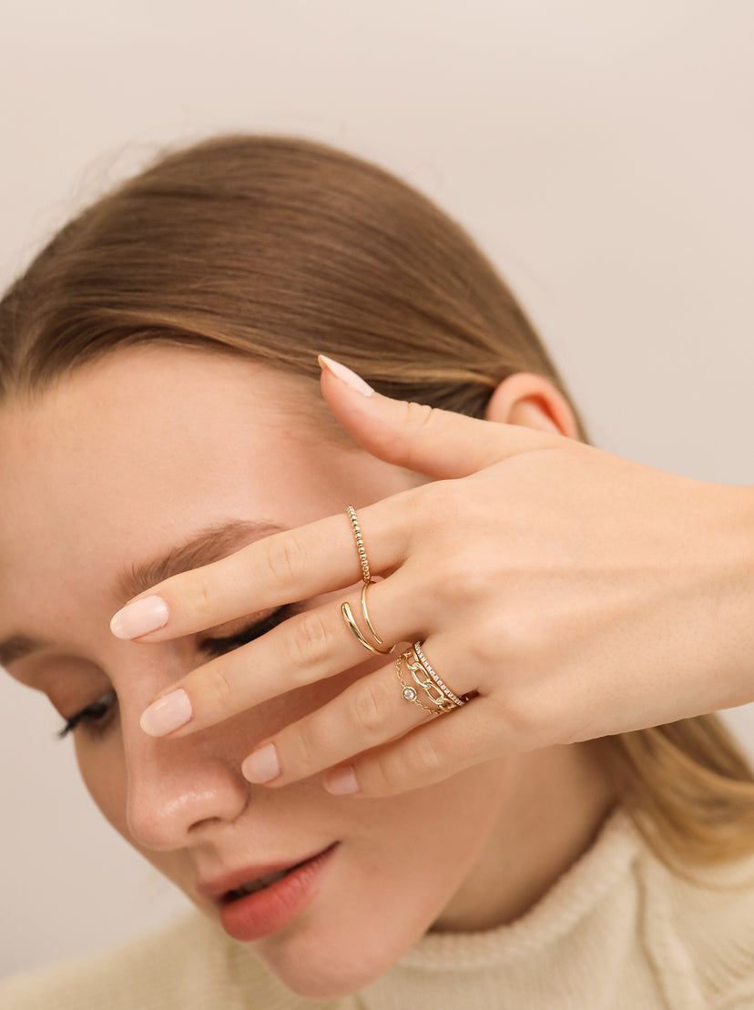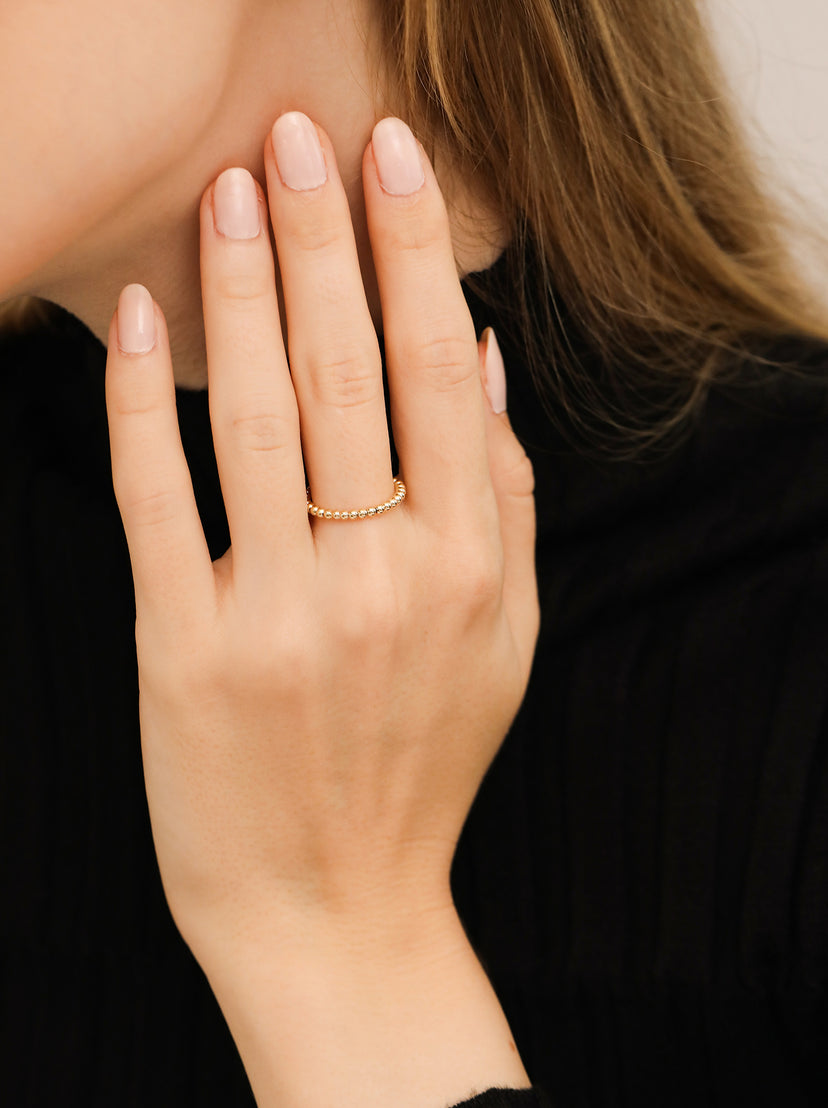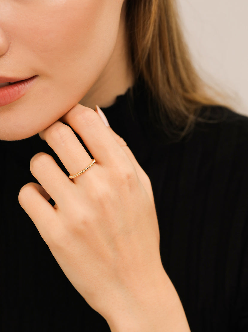 Handcrafted in 9K solid gold featuring a monotonous beaded finish that’ll add texture and whimsy to any stack–and for your every occasion. Wear it on repeat. Style solo or pair it with our Mini Beaded Diamond Ring to double the allure and spark.