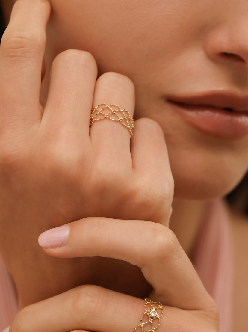 Intricately designed to create a lace-like effect, this solid gold, fully flexible and adjustable ring weaves around your finger effortlessly. Thanks to its unique faceted details, it shimmers subtly in the light making it the understated sparkler you never knew you needed.