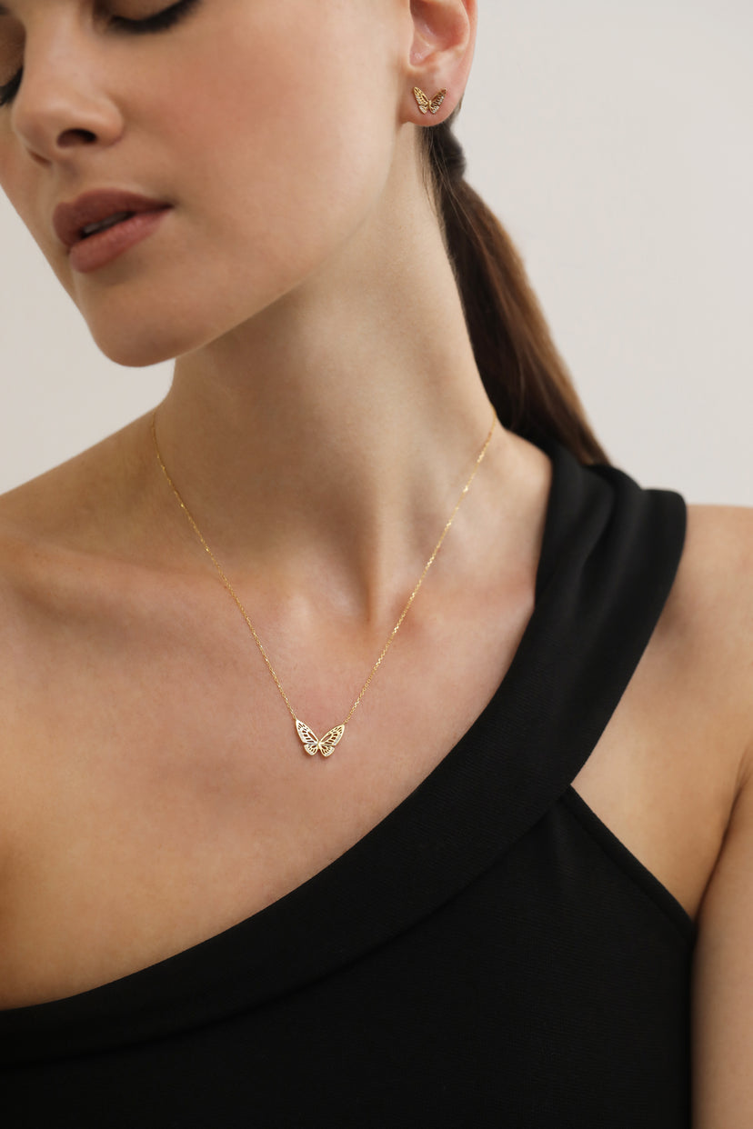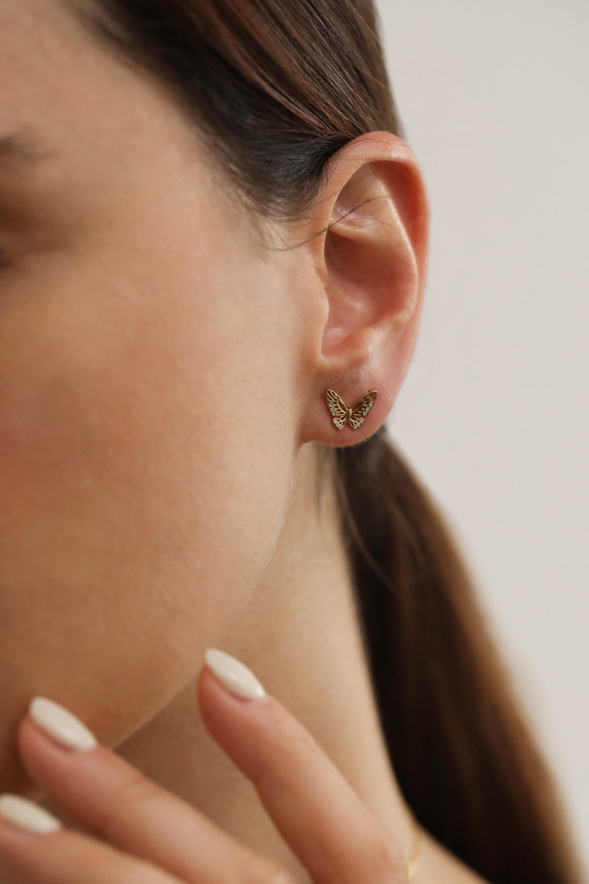 Designed with versatility in mind, the Monarch Butterfly Studs feature sprinkles of conflict free diamonds upon the dainty solid gold base to lend any of your outfits a feminine allure. Wear yours everyday, so they greet onlookers with a subtle dazzle whenever you tuck you hair behind your ears.