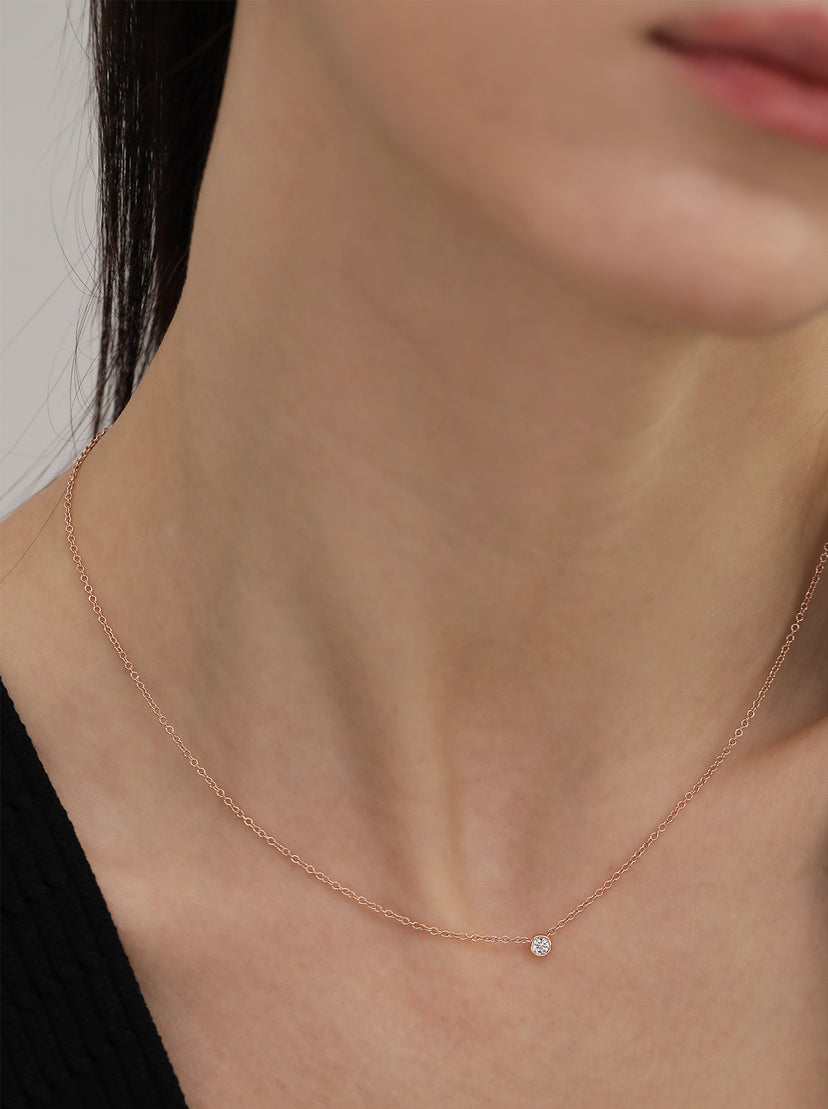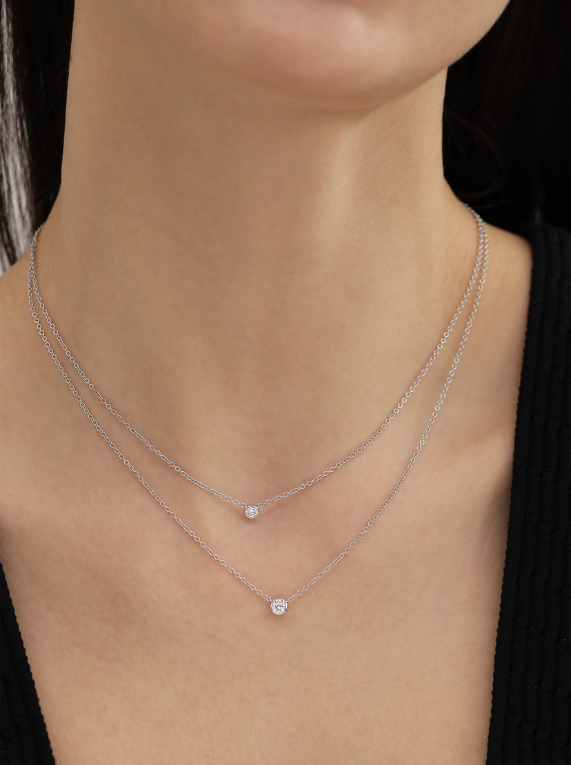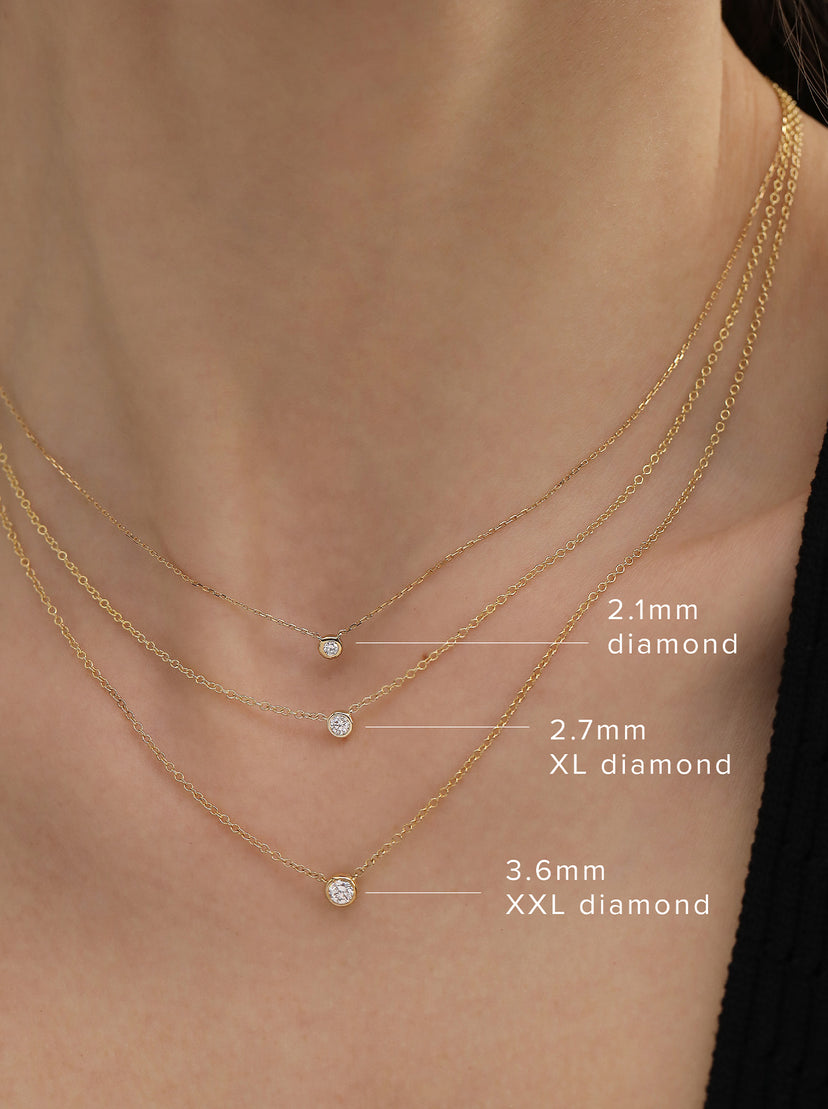 A reiteration of our signature Bezel Necklace—it’s the same Bezel, just double the size.Featuring a bigger and brighter, brilliant-cut diamond on our classic solid gold chain, its emboldened design is made to bedazzle all your moments and catch every eye. Ampler yet lightweight, the piece is yours to hold forever.