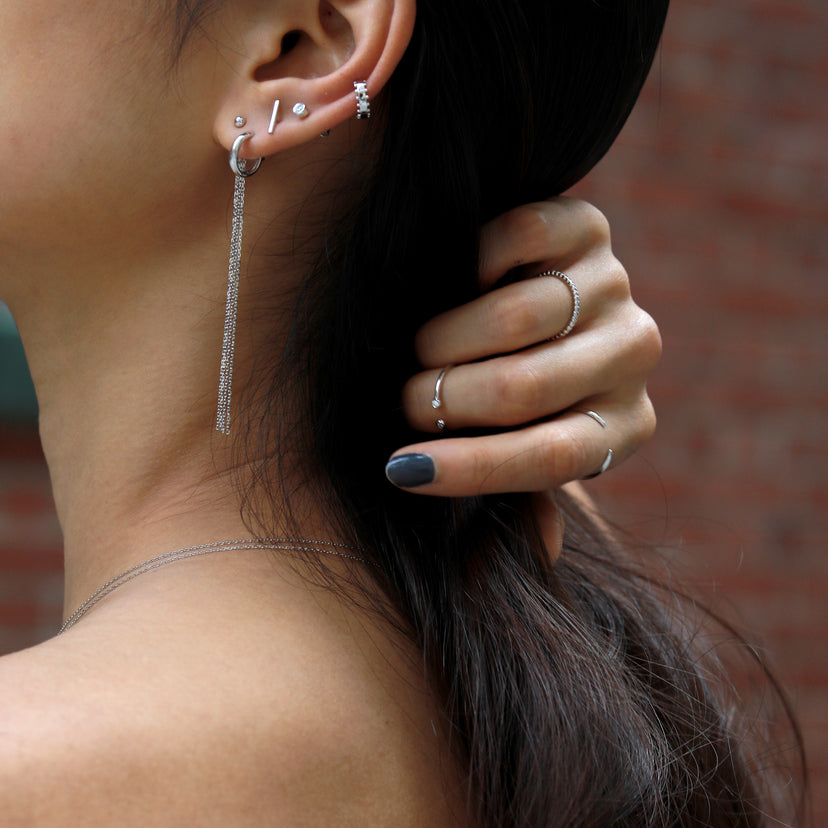 While beautiful in color, pure silver is too soft to be made into jewelry. That’s why most silver jewelry is made of 925 sterling silver: a mix of 92.5% pure silver and 7.5% of other metals, like copper. While sturdier than pure silver, sterling silver jewelry without plating is still prone to tarnishing. We plate all our solid silver pieces with a layer of rhodium to keep it looking bright, smooth, and scratch-less for years to come.