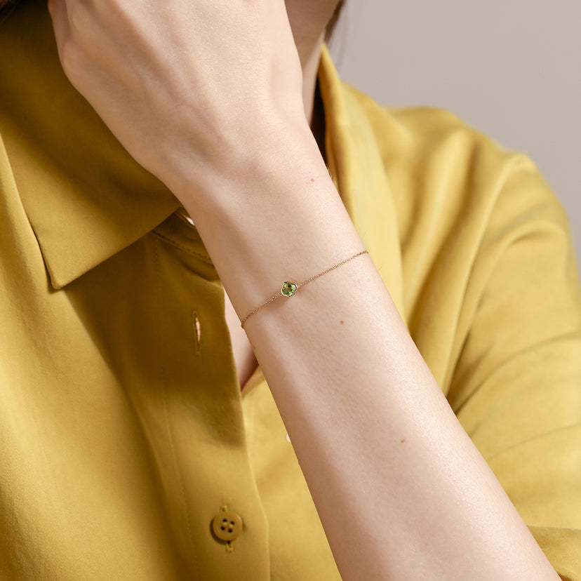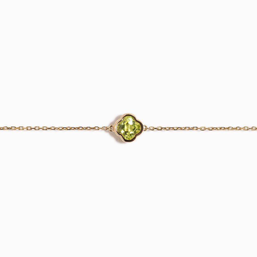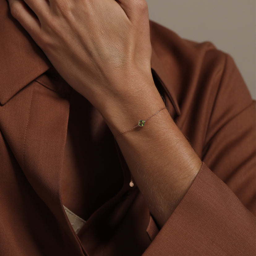 Dainty yet packed with attitude — don’t underestimate this solid gold bracelet’s power to elevate your every outfit. A vibrant peridot encased in shimmering gold and suspended from a delicate cable chain draws all eyes to your wrist. Wear it with the matching ring and necklace for triple the wow-factor.