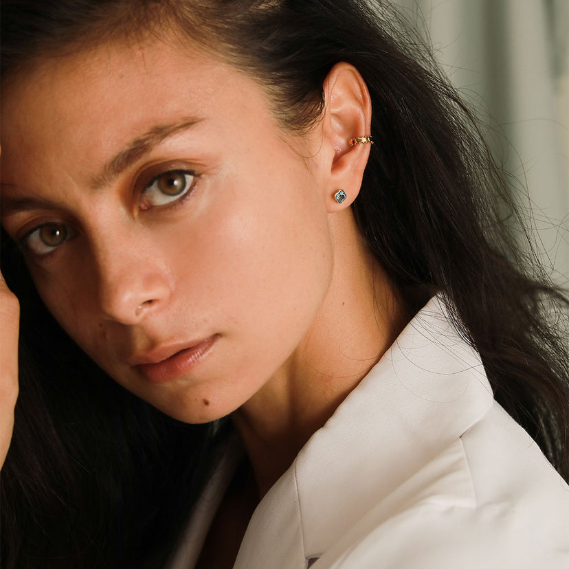 - Made in 9K or 18K solid gold and set with ethically-sourced Swiss blue topaz, mined in Brazil.