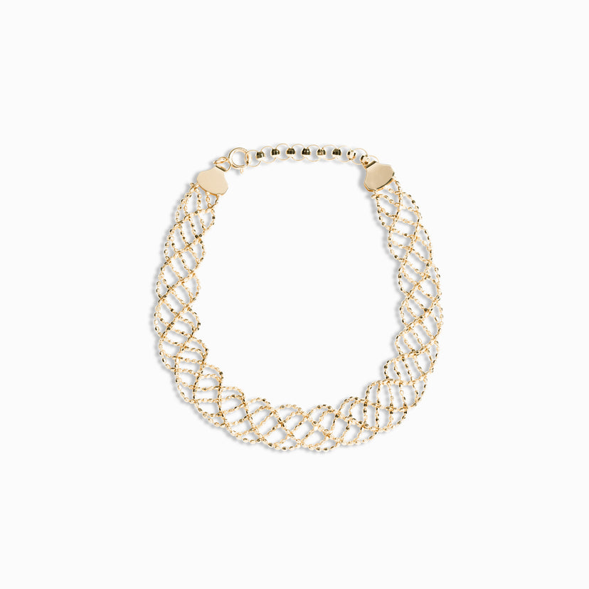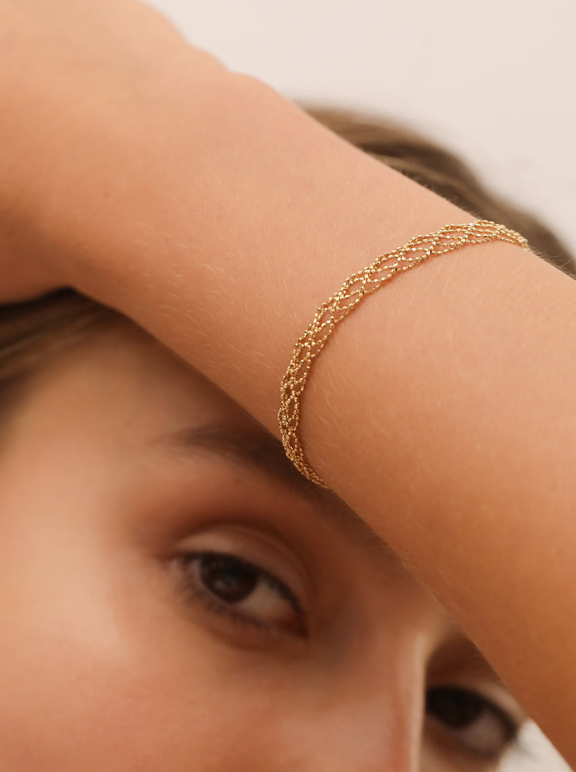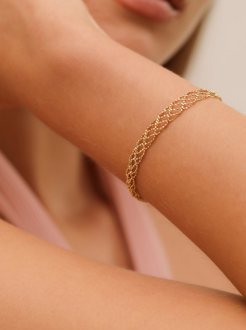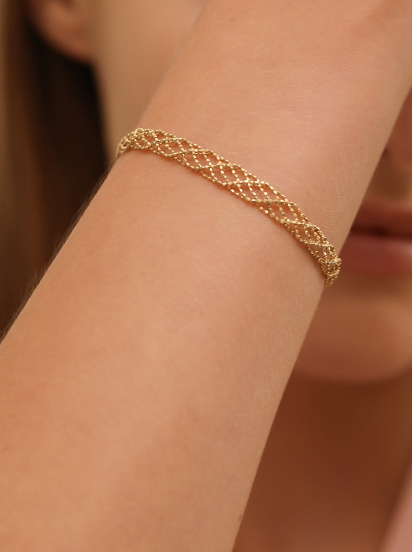 Like exquisite knitwork in shimmering solid gold, this lace-inspired bracelet will make heads turn. Flexible and fully adjustable, it can be worn laidback loose, or close-knit for elegance, depending on the occasion.