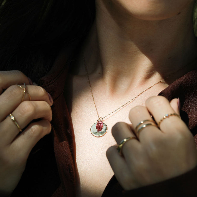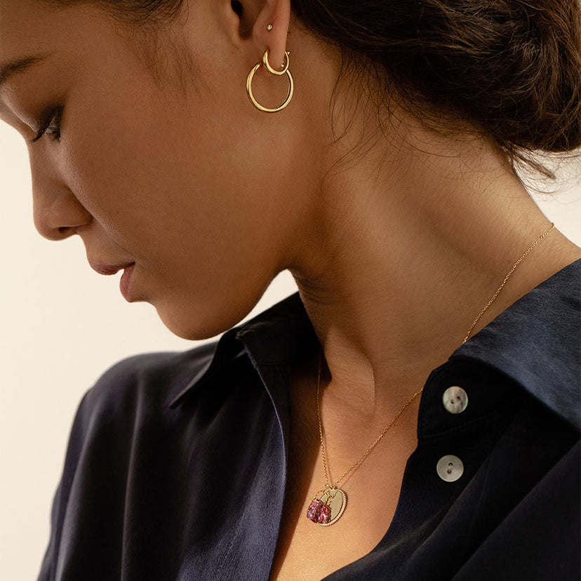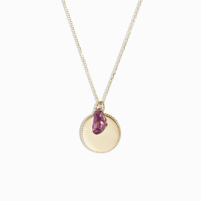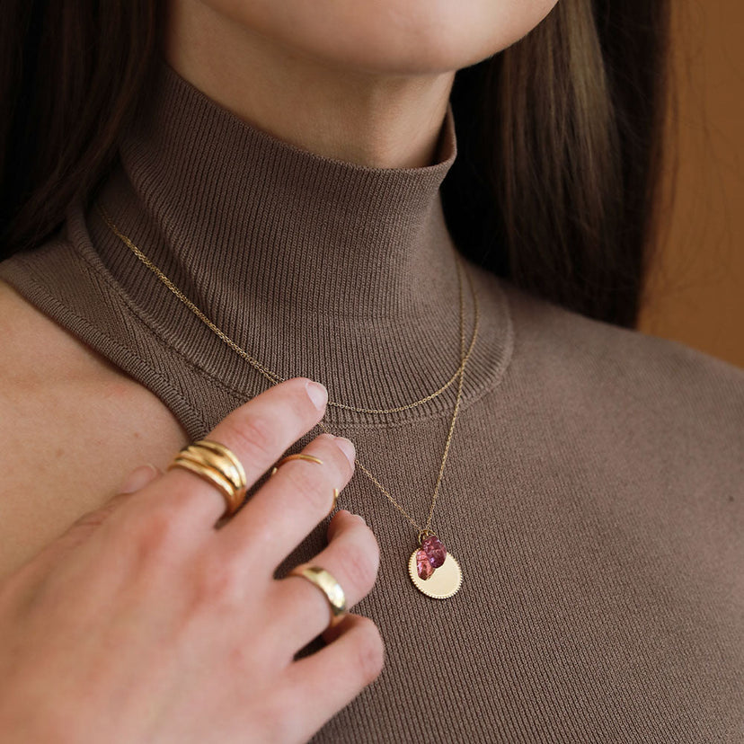 This conversation-starting necklace showcases an uncut rhodolite garnet, hand-picked for its beautiful colour and natural shape. The gem is fully traceable from mine to market, all the way back to the woman who mined it. We’ve slightly polished the gleaming rhodolite to bring out its vibrant colour and complemented it with a glistening solid gold medallion that can be engraved.